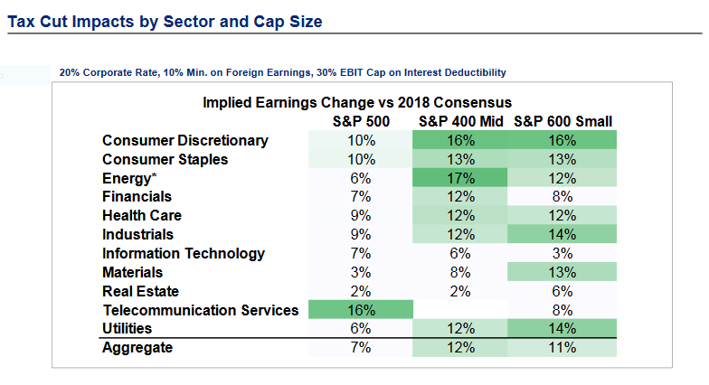 The table above highlights the beneficiaries of tax reform by sector. Overweight small caps, financials, capital goods, and cyclicals. Business investment has been a weak area in this recovery in both the USA and world-wide. Low interest rates, strong demand, and solid profitability should produce solid capex spending world-wide in 2018.
