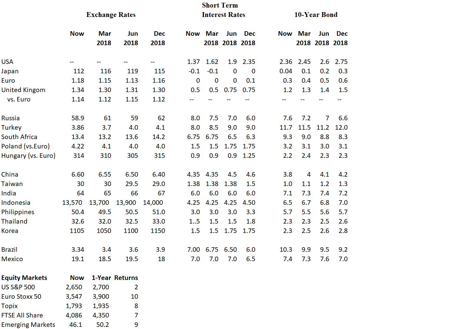 With real rates low in developed markets, EM debt will remain attractive, at least during H1 2018. Fundamentals differ significantly: so be selective. Good opportunities exist in Brazil, Mexico, Russia, and Indonesia. Continue to avoid Turkey!