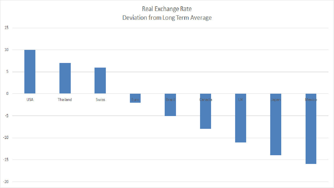 American should also pressure Japan to boost import of US services — the earlier Chart shows that sales in this key sector are a fraction of their potential. Focus also on sectors demanded by an aging population, e.g. health care, robotics, AI, etc. Currencies could be a talking point, as the Chart illustrates that the Japanese yen is quite undervalued (as are the Mexican peso and Canadian dollar).
