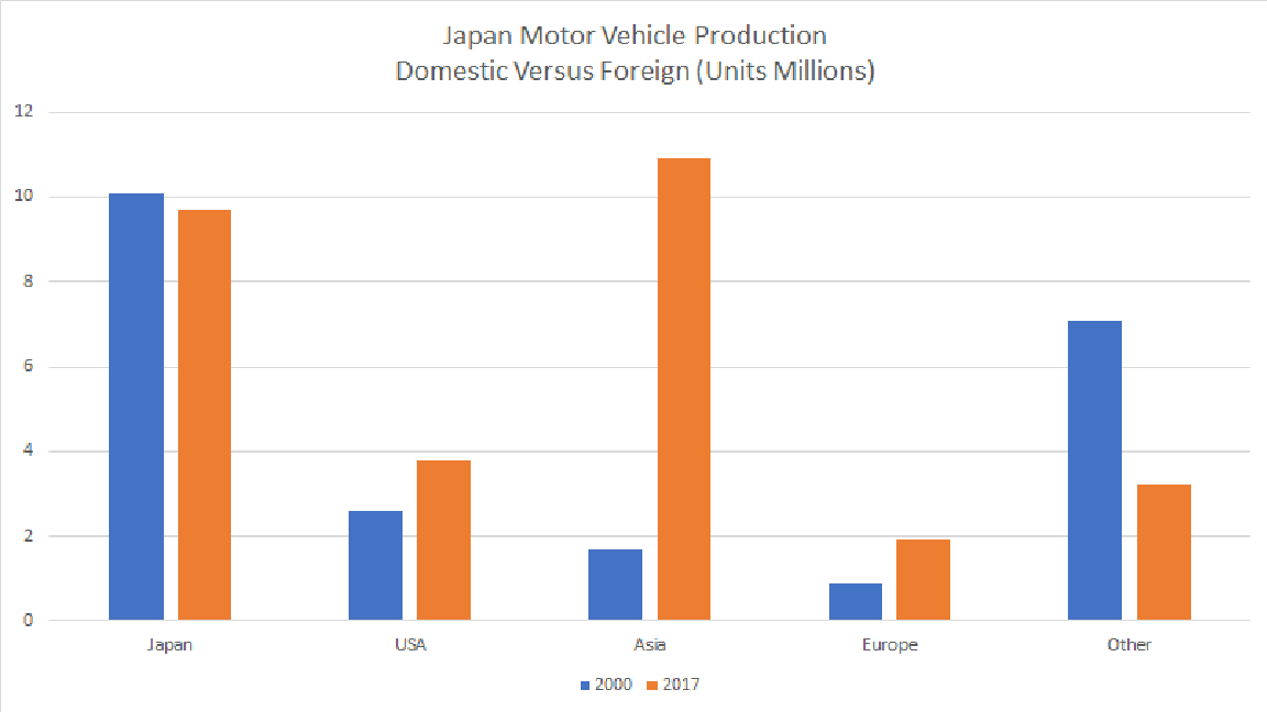 Amazingly, motor vehicles account for virtually all of the bilateral trade deficit ($53bn of the $57bn total). The motor vehicle industry is hugely important in Japan: the industry accounts for 9% of employment and 20% of factory output. Exports, especially to the USA, are critical — 50% of domestic production is sold abroad, half of which heads to the USA. Even though Japan imposes no import tariffs on autos, the domestic market is heavily protected. American automakers are not alone, vehicles represent only 3% of Japanese imports. US demands for greater access are understandable, but would face serious political resistance. Alternatively, Secretary Ross urges Japan to produce more cars in the USA. However, Japan’s US production is already twice as large as its exports to this vital market. Indeed, the Chart shows that production in the USA has increased 60% since 2000, and Japan already accounts for roughly 30% of vehicle production in the United States.