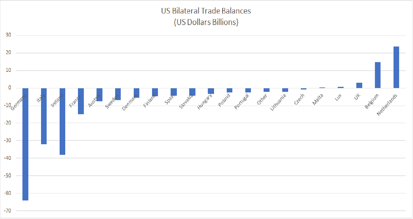 US trade performance with individual Europe nations is also revealing. The USA runs deficits with 21 of the 27 EU members, which highlights the macro causes of the imbalance. Moreover, roughly 2/3 of the US deficit emanates from just two countries: Germany and Italy.