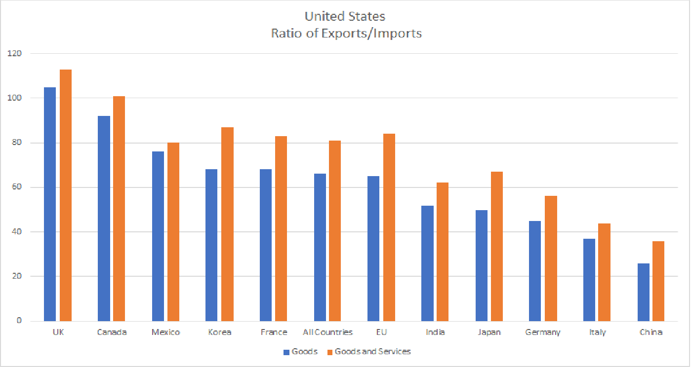 Also, the next Chart illustrates that trade imbalances with Canada and Mexico were never big problems: their Export/Import ratios were not out of line with America’s trading partners world-wide. Does the Chart provide clues as what to expect, as US trade policy turns elsewhere?