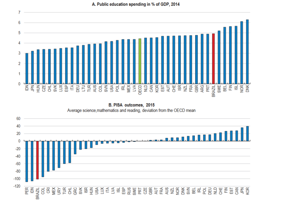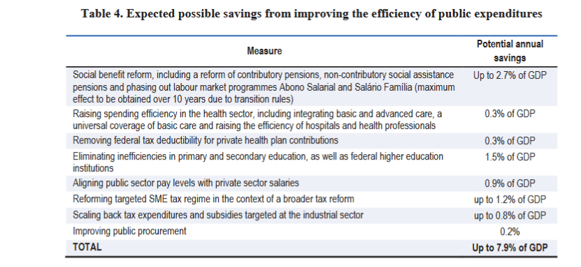 In the Table above, the OECD identifies additional sources of budget savings. I highlight a few of the most important. For instance, the next Chart highlights that Brazil rightly spends generously on education: roughly 15% of public sector spending. However, educational achievements are distinctly sub par. Greater efficiency could improve results and/or save money. The WEF ranks the quality of Brazil’s education system at 128th out of 137 nations.
