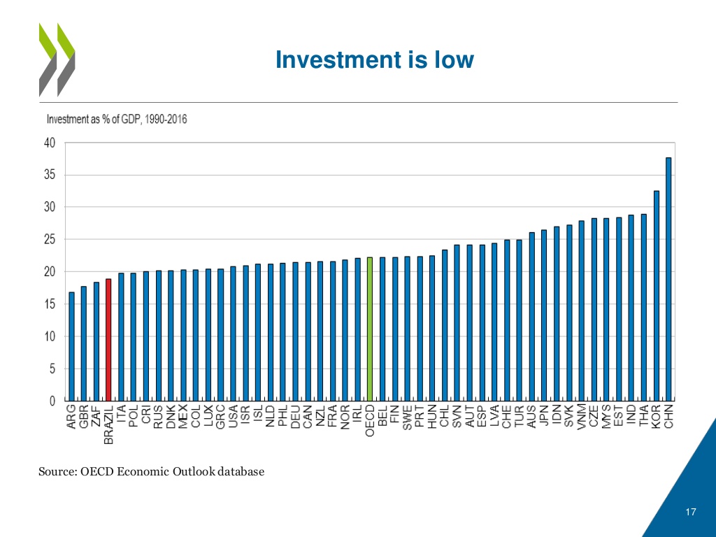However, Brazil is only now limping out of the severe 2014-16 recession, which followed in the wake of the GFC. And, the nation remains amongst the most inequitable in the world (Chart above). The World Economic Forum (WEF) annually compares the competitiveness of nations. In 2018, Brazil ranked 80th (out of 137 countries), down from 48th as recently as 2013. Brazilian voters are sceptical that their political leaders have the answers. Indeed, in the 2018 WEF report Brazil ranks dead last for trust in politicians, diverting public funds, and efficiency of public spending. Last, think about that! With the help of an outstanding Survey by the OECD (which I strongly recommend reading), I will highlight a few key, post-election priority areas, and I will assess the chances of Brazil’s successful return to inclusive economic growth. Emerging market investors are expecting immediate action. The next few months may prove decisive, so buckle up!