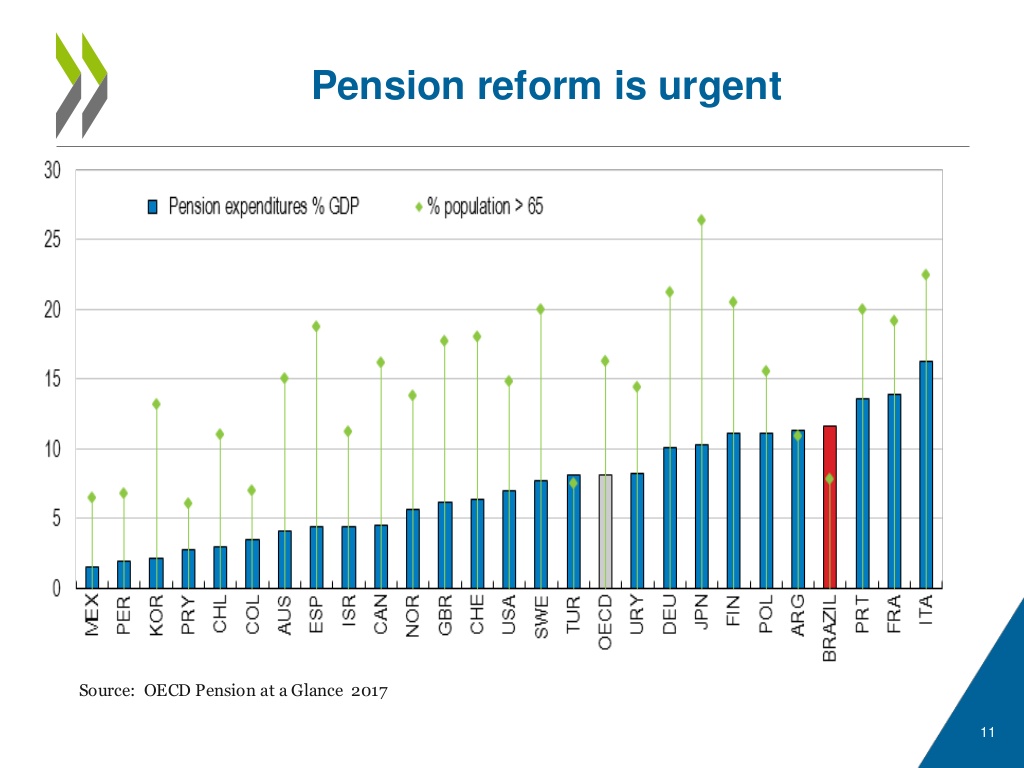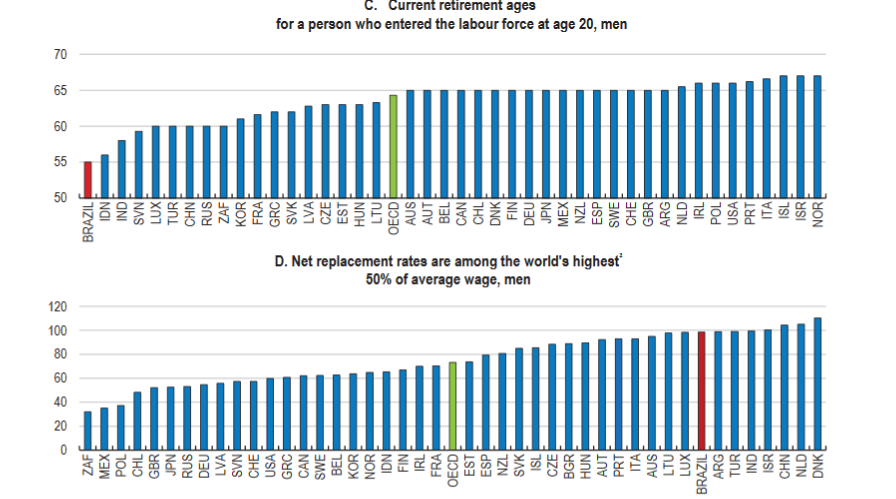 Unpopular, but fundamental changes are inevitable. The above Chart shows that Brazil’s retirement age is the world’s lowest. And, the pension system is considerably more generous than the OECD average.
