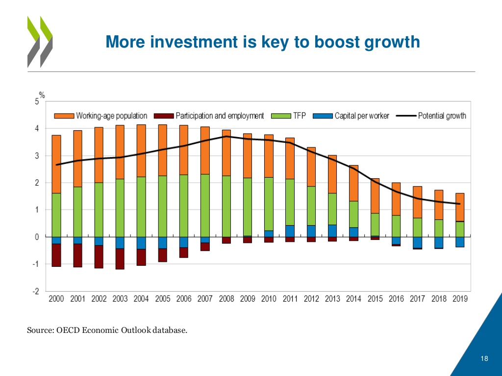 Following the election, policymakers must address two budgetary objectives. Most urgently, the overall deficit must be reduced to prevent an uncontrolled rise in the government debt/GDP ratio. The OECD’s chart above illustrates that in the absence of radical reforms, the debt ratio — now 84% of GDP — will race well above 100% of GDP during the next decade. To be fair, the previous government outlined measures to freeze future spending in real terms and reform the pension system, which would stabilise the debt ratio by 2023 (at over 90%). However, in the run-up to polling day the pension measures have been shelved, and this year’s pre-election fiscal stimulus casts doubts on the credibility of the pledge to curb future spending. In order to stabilise the debt ratio, I estimate an overall fiscal adjustment approaching 5% of GDP will be required in coming years. Needless to say such a painful adjustment will be unpopular.