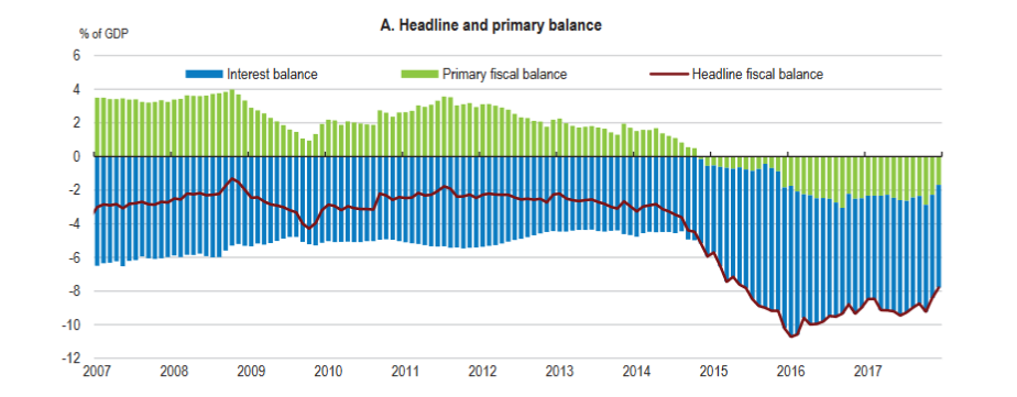 In response to the GFC and the deepening domestic recession in 2014, however, fiscal policies understandably turned expansive. The sharp rise in the budget deficit — peaking at 9% of GDP in 2016 — can be attributed to a 5% of GDP rise in public spending.