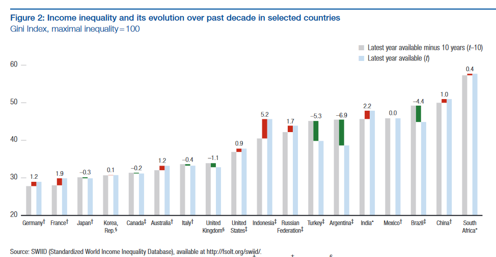 Brazil will go to the polls next weekend in perhaps the most wide-open, consequential election in its history. I will leave it to more clever pundits to predict the outcome (especially after Brexit and the US election results!). Rather, following recent volatility in emerging markets, I will outline the challenges the next Brazilian government will face after polling day. Specifically, can Brazil get back on the path of sustainable, inclusive growth? Given the economy’s recent sub par performance, it is easy to forget the successes of the decade prior to the Global Financial Crisis (GFC). Indeed, between 2000-08 GDP advanced 4% per year, Brazil became the world’s 8th largest economy, inflation declined from 3,000% in 1995 (and 20% in 2003), and 25 million people were lifted out of poverty. And, Brazil’s growth was inclusive: the Chart illustrates that Brazil was one of the very few countries that reduced inequality during this period.