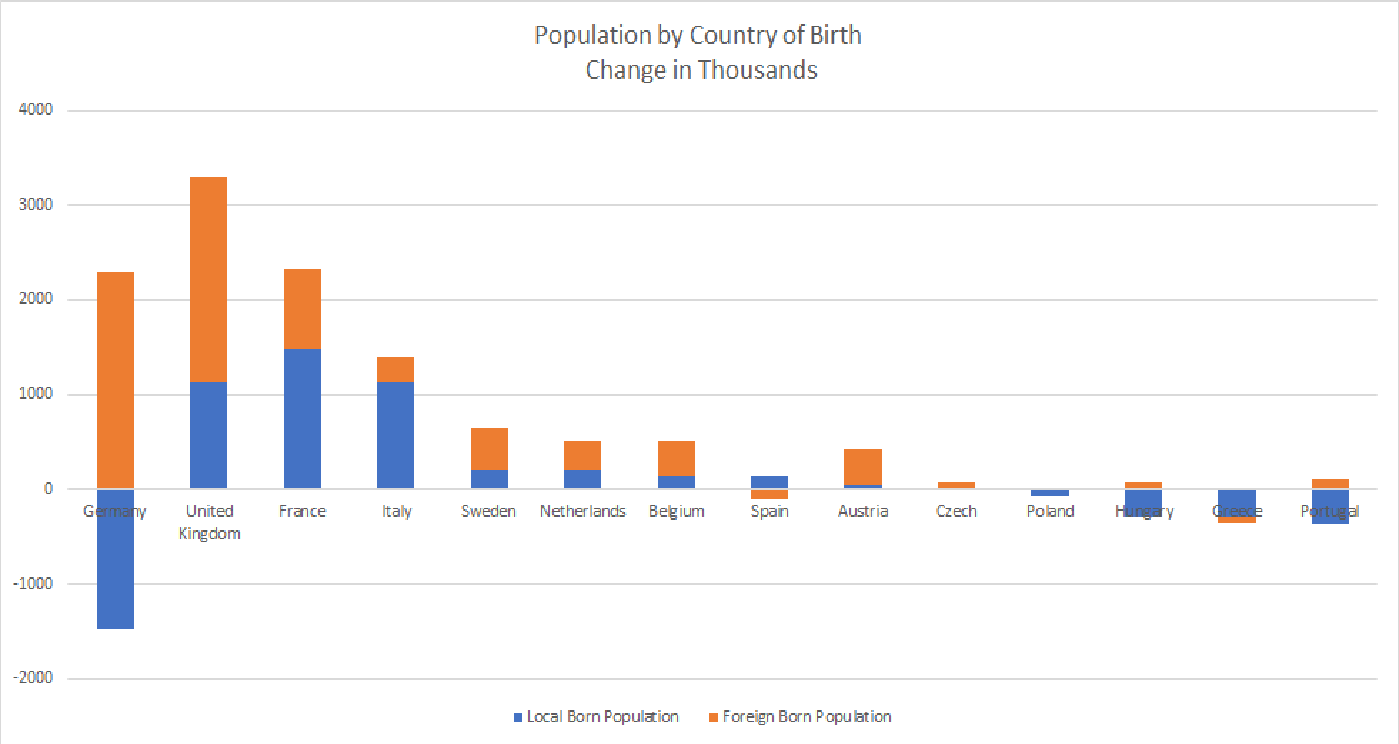 Immigration can help solve this problem. The following Chart illustrates that Germany’s local population has already fallen sharply since 2010. However, the inflow of foreign-born workers has more than offset these declines. The adverse political reaction to the dramatic inflow of asylum seekers in 2015/16 is understandable. However, the inflow of young, high-spending immigrants can play a role in boosting GDP growth, as well as curbing the trade surplus.