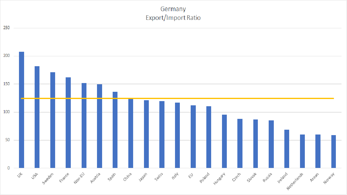 The following Chart provides insights into Germany’s industrial and trade strategy. First of all, Germany has a trade surplus of $75bn (nearly 2.5% of GDP) with their EU neighbours. Such a large imbalance will remain contentious in negotiations on EU reform. In addition, Germany runs deficits with energy-rich countries, eg Russia, Norway, and the Netherlands. Likewise, shortfalls exist with many Eastern European countries, which are a valuable part of the supply chain for Germany’s powerful industrial sector.