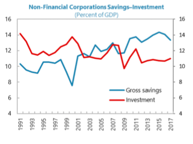 Likewise, the first Chart indicates that excess savings in the corporate sector — that is, the gap between corporate savings/profits and capital investment — has expanded by over 5% of GDP. The following Chart illustrates that firms’ profitability is not too blame, as gross savings have risen. Rather, corporate investment has slumped steadily during the past two decades.