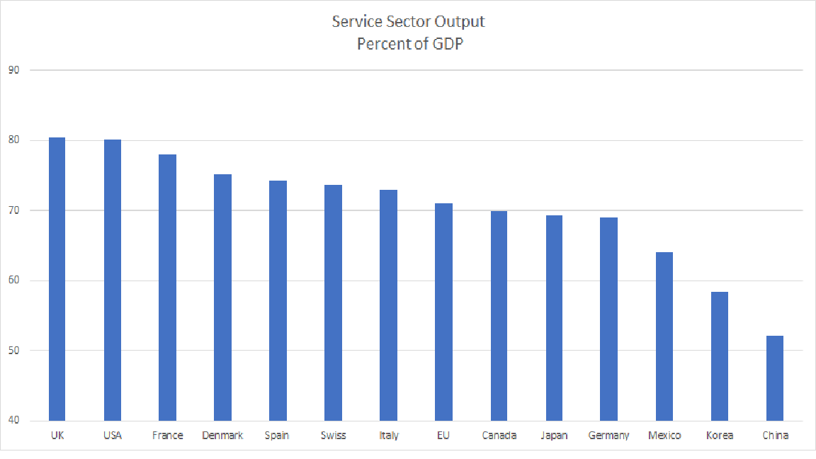 What’s going on? Let’s start with trade in services where the USA has a distinct comparative advantage. However, Germany is one of the few countries with whom the USA has a deficit in this key area. The Chart illustrates that German imports of US services are low compared to most other European countries. Even if Germany is not discriminating particularly against US services, this sector of the German economy is highly underdeveloped, e.g. services represent only 67% of GDP compared to 80% in the USA and UK. For their own national interest, deregulation and expansion of this key, job-producing sector should be a priority for Germany. As an added benefit, if Germany imported the same amount of American services as the UK (as a percent of GDP), this would eliminate the bilateral deficit.