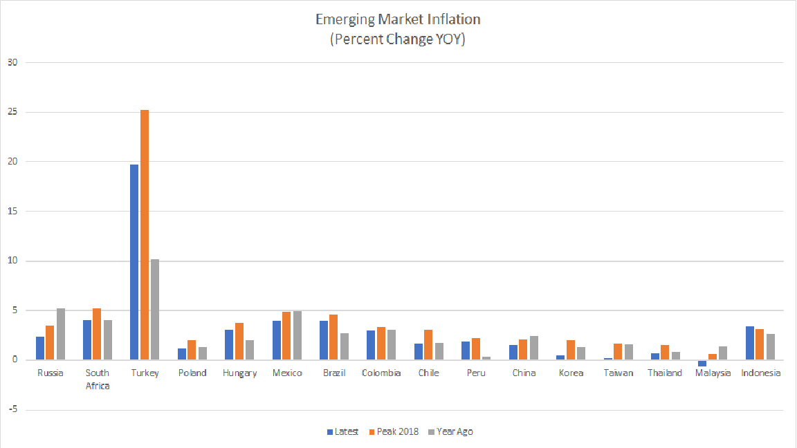 The low, stable inflation conditions also exist within Emerging Markets. In Asia, the Chart highlights that in all cases except Indonesia, price gains are lower than a year ago — in part helped by reduced energy costs (in particular, note the deceleration in inflation since last Summer). In both Mexico and Brazil, the impact of past FX weakness has run its course, and price growth will decline this year. Similarly, the deleterious effect of previous FX devaluations is now over in Turkey, South Africa, and Russia. Inflation will head lower, especially in Turkey (which might actually meet its 12% objective).