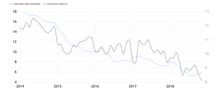 Preferable would be to use fiscal policies to stimulate household incomes directly — the recent income tax cut and the proposed VAT reduction represent progress. The following Chart illustrates that both retail sales and fixed investment are slowing sharply. However, the recent upturn in FAI suggest that infrastructure spending may have been funneled through state-owned enterprises, which is a highly undesirable throwback to past resource misallocation.