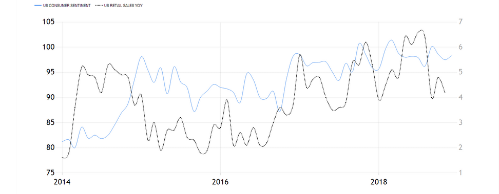 First of all, fundamentals for consumer spending, representing over 70% of the American economy, remain healthy. Employment gains and accelerating wages are boosting incomes, which are now receiving additional support from falling energy quotes. The Chart above illustrates that consumer confidence is near an all-time high, and that Christmas spending activity was buoyant.