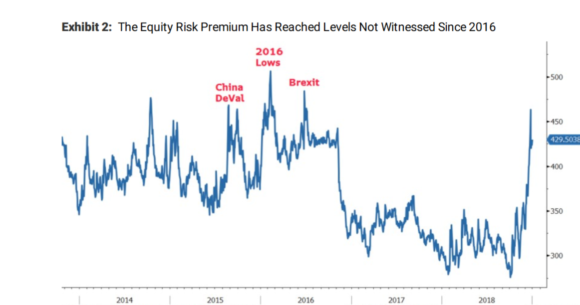 - In September, I suggested that US equity returns would be modest, as the S&P 500 remains this year in a 2400 to 2900 range, as rising interest rates and slowing growth provide headwinds. Following the recent correction and bond market rally, however, equities are at their cheapest level (relative to fixed income) since the sell-off in 2016 (above chart). In a volatile, range-bound market this year, I have been buying the current dip! Beware of the sharp deceleration in EPS growth that will become evident in the upcoming earnings season!