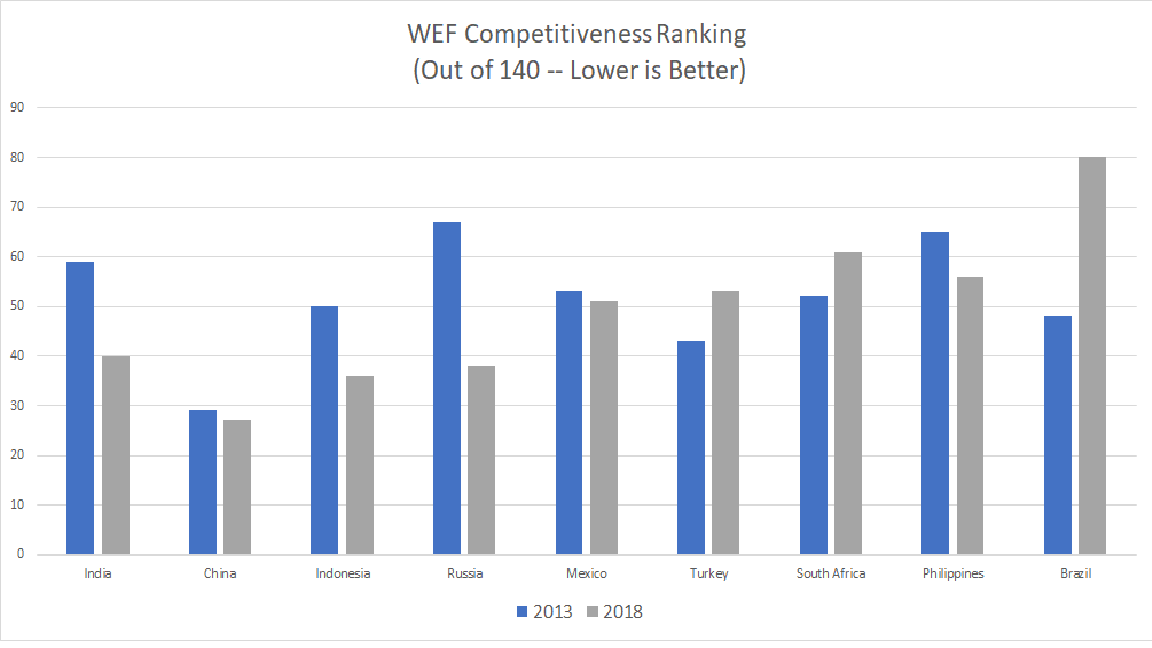 The World Economic Forum’s (WEF) competitive index illustrates that reform has improved India’s business environment more dramatically than any other emerging market in recent years (Chart below). Nevertheless, the survey illustrates that competitiveness still lags other key countries (especially China), and underscores the need to sustain reform momentum.