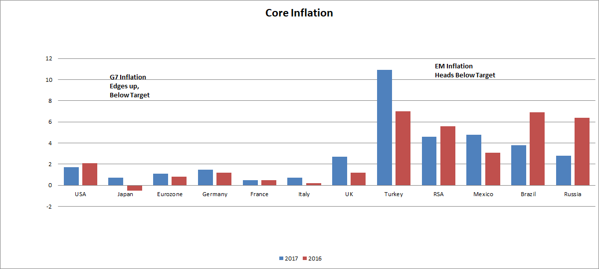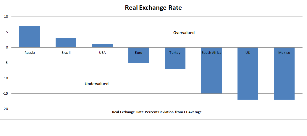 - Falling inflation creates good investment opportunities in Emerging Markets, especially Russia, Brazil, and Mexico. The undervalued MXN will outperform, BRL and TRY will weaken