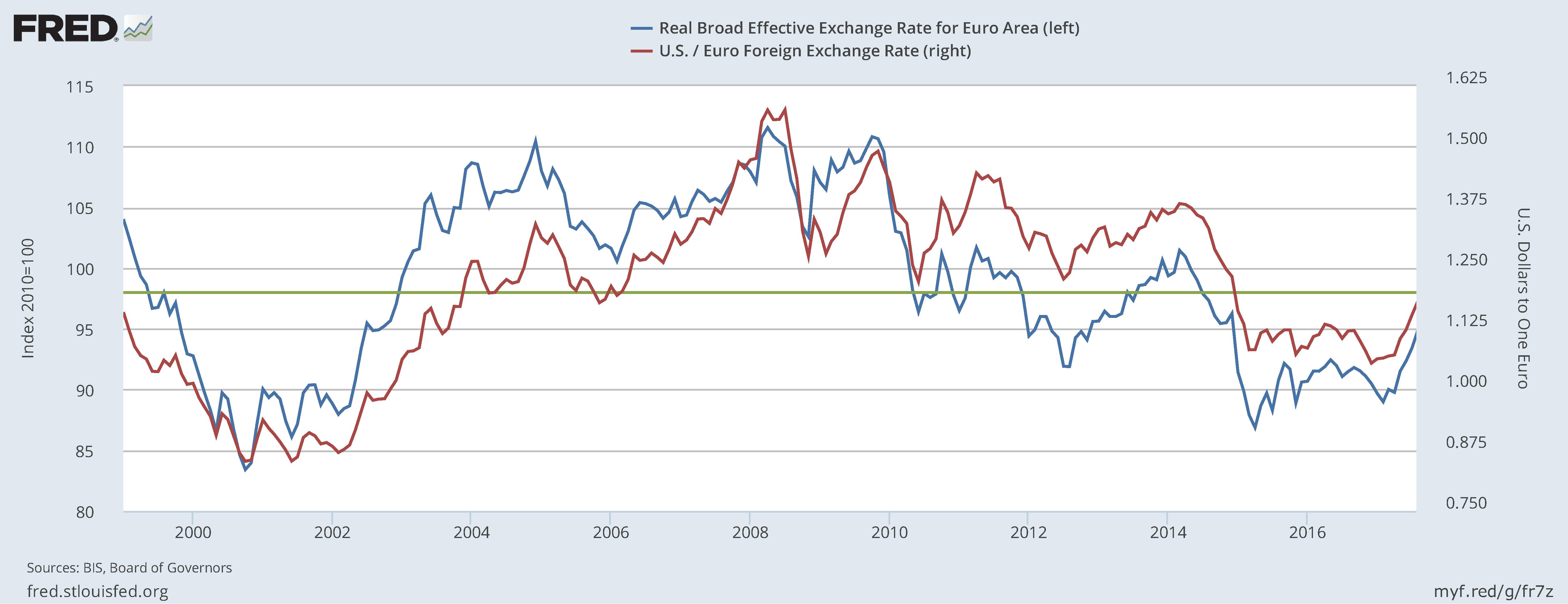 At its September meeting, the ECB addressed how the Euro’s sharp appreciation may influence monetary policy. As Chart 2 illustrates, the Euro is only now approaching fair value. Indeed, the currency may still be cheap, and European exports are expanding still at a healthy 6% clip. Moreover, while import prices have been declining lately, this reflects lower oil prices more than FX effects. Consequently, the Euro could rise another 5-10% (which I do not expect near term) before the ECB would become overly alarmed.