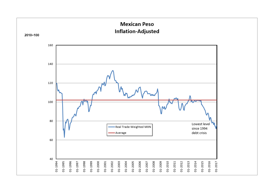 What’s behind this altered policy and the peso’s extreme valuation? In recent years, the Mexican economic performance has been imbalanced: relying too heavily on consumption benefiting from low interest rates and solid employment gains. Meanwhile, exports have struggled. As a consequence of this mismatch, Mexico’s current account deficit widened from 1% to 3% of GDP by 2016.