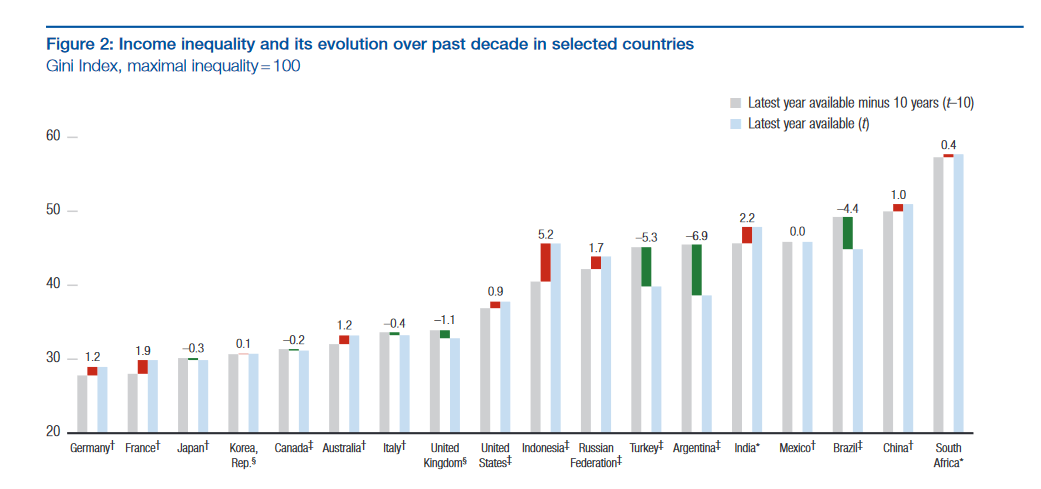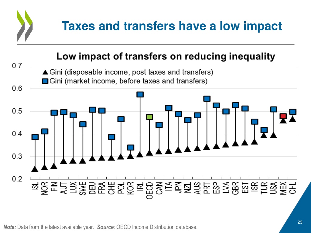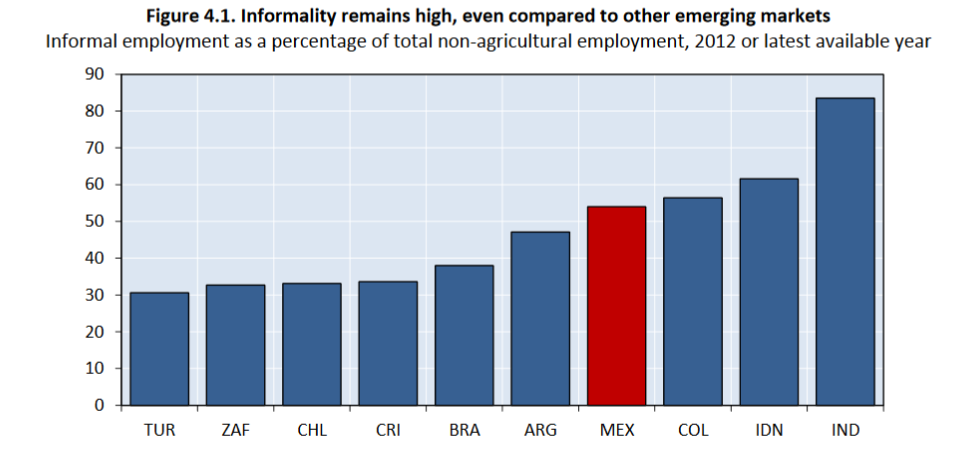 There are two ways Mexico’s budget can play a role. The Chart above illustrates that not only is inequality is high, but the current taxation and spending regime does not reduce the gap, as it does in most other countries (which leads to lower post-tax Gini coefficients). Therefore, existing spending programs should be more targeted at the poor. However, the real potential lies in raising tax revenues. In Mexico, for example, government receipts amount to only 23% of GDP compared to 37% of GDP in the OECD overall. An important way to improve tax compliance is to reduce the very high level of “informality” in the economy (Chart). Firms working outside the formal economy often avoid taxes. Likewise, workers in the informal economy (often agricultural and service jobs) are often poorly paid, which is contributes to poverty. Fortunately, informality is declining, which could boost government revenues over time.