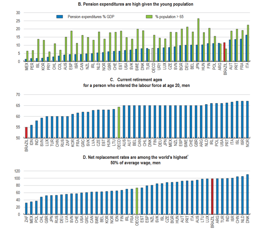 Of course, there is widespread recognition that deep-seated pension reforms must play a big role in the adjustment. Indeed, these expenditures amount to 10% of GDP, and nearly one-third of overall government spending. The following Charts illustrate the generosity of all features of the current program: low retirement age, short contribution periods, high replacement rates, etc. Note especially the high level of spending compared to Brazil’s youthful population. Additional strains will emerge as Brazil’s population ages in coming decades.