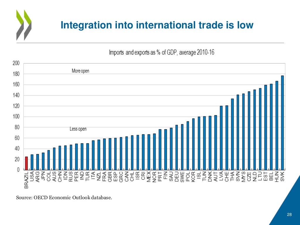 Finally, the following Chart illustrates that Brazil relies less on international trade than other G20 economies. Deeper integration into the global economy would contribute to productivity improvements and support long-term GDP growth.