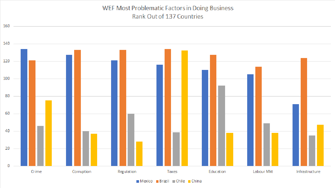 The World Economic Forum points to key areas for reform which will help boost productivity. Of course, reducing crime and corruption are at the top of the agenda. The next Chart indicates Mexico has the amongst the world’s worst track record on crime, and lags well behind peers on corruption.