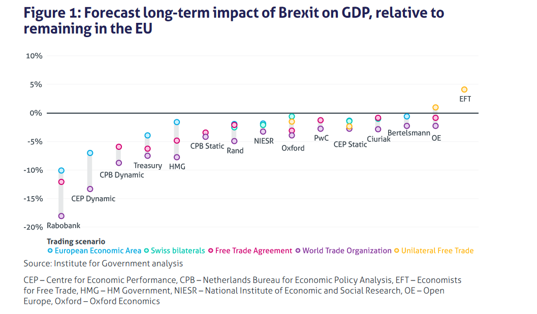 Chart 1 provides a subset of the numerous projections of Brexit’s impact. The negative consequences on GDP range between 2% and 15%, depending on the nature of the future relationship with the European Union. No Deal/WTO produces the most adverse results, including an especially stark Bank of England forecast. To be sure, pre-referendum forecasts were similarly bleak, as Brexiteers often remind us. Critics fail to acknowledge, however, Brexit has two potential consequences — the initial shock and the long-term corrosive effects. Fortunately, pre-emptive Bank of England actions — including an interest rate cut — helped the economy deal with the initial shock following the referendum decision.