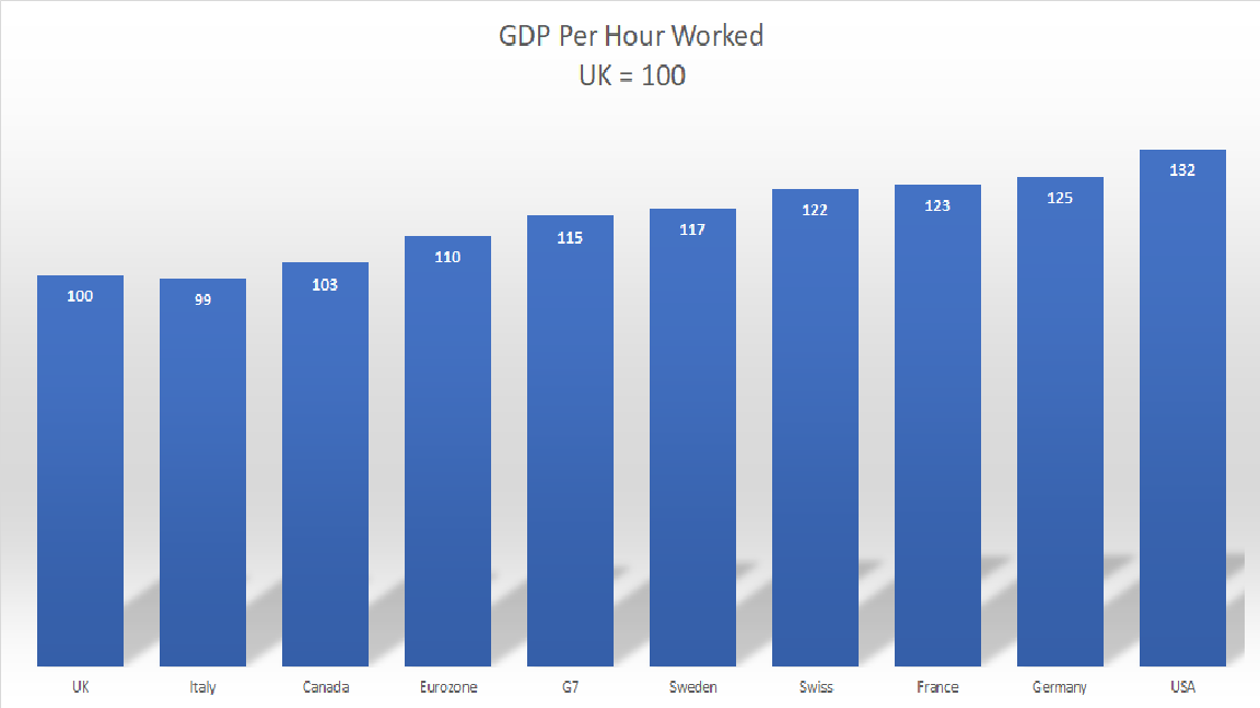 The United Kingdom suffers from a chronic productivity deficiency compared to its major competitors. Indeed, the Chart above illustrates UK efficiency lags the G7 and the USA by 15% and 32% respectively. The following Chart illustrates the UK was successfully narrowing the gap during the two decades prior to the Global Financial Crisis (GFC), e.g. efficiency gains were on par with USA and rising faster than in France and Germany. Following the GFC, however, British productivity improvements have stagnated, again widening the shortfall versus key trading partners.