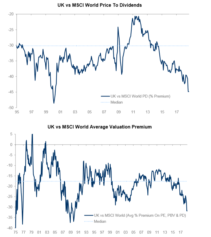 - Likewise, UK equity valuation have rarely been cheaper relative to the rest of the world. To be sure, UK equities should trade at a discount to European stocks initially following Brexit. My recommendation to overweight UK stocks may be premature. However, unless the UK slips into recession next year, cheap valuations should help the FTSE outperform next year.