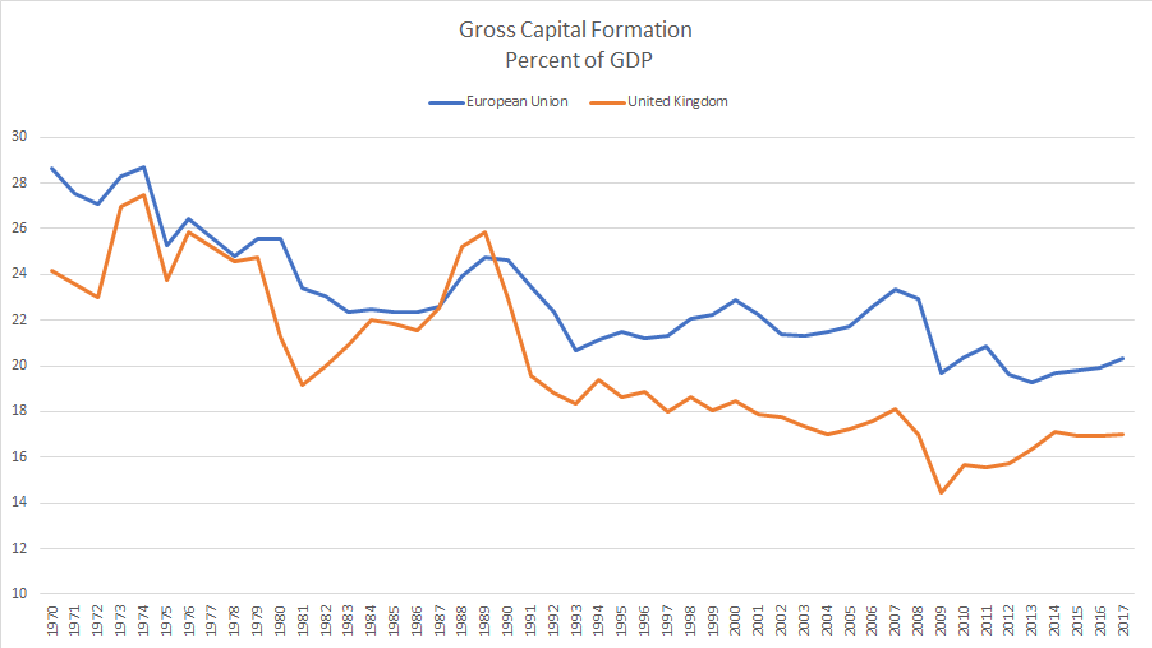 Secondly, low levels of savings and investment lead to weak productivity, and diminish long-term GDP growth. As discussed, Brexit anxiety is already adversely impacting capital spending. The Chart above illustrates UK business investment has lagged the European Union for nearly two decades.