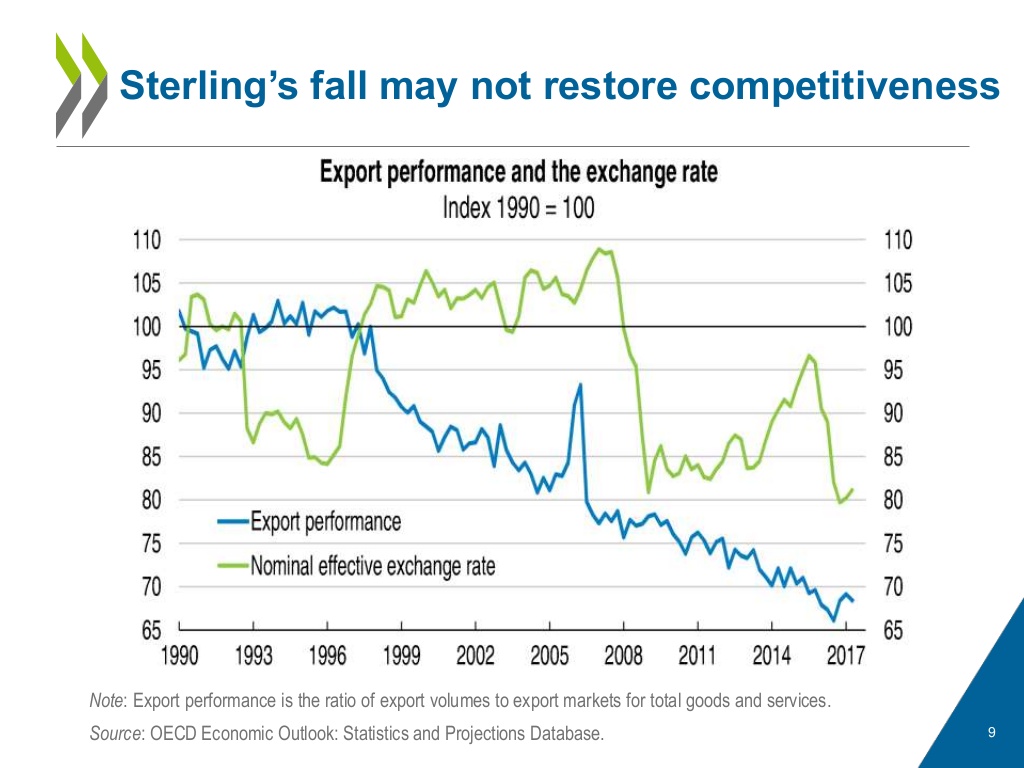 Brexit is likely to exacerbate this problem. There is a widely accepted link between productivity and the competition promoted by free trade. Many factors have contributed to sub par UK productivity, e.g. defciencies in educational achievement, infrastructure, R&D spending, business investment environment, geographic/regional inequality, and housing. The distraction of Brexit — along with the fiscal strains resulting from the GFC — continue to prevent policymakers from seriously addressing these issues.