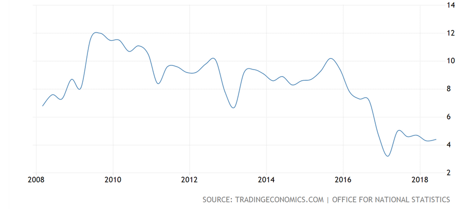Firstly, strong global growth and the post-referendum sterling collapse boosted UK export volumes nearly 6% in 2017, and the trade sector added 0.7% to GDP. This benefit is now fading: sales abroad have risen only 1.5% this year, and will slow even further next year. Moreover, the following Chart illustrates UK export have become less sensitive to currency movements, reflecting both the UK’s participation in EU-wide supply chains and the nation’s chronic productivity deficiency (more later). Rather than adding to 2019 GDP, the external sector is likely to exert a 0.3% drag on growth next year.