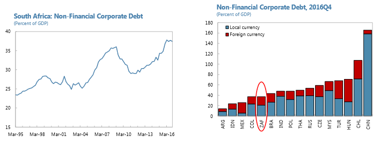 Despite this mixed picture, South Africa’s corporate sector is one of the more profitable in the EM universe. To be sure, as is true world-wide, RSA’s firms have increased debt in recent years. However, the following Chart indicates that corporate debt levels are more manageable than in many EM nations.