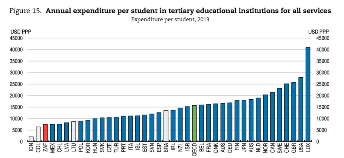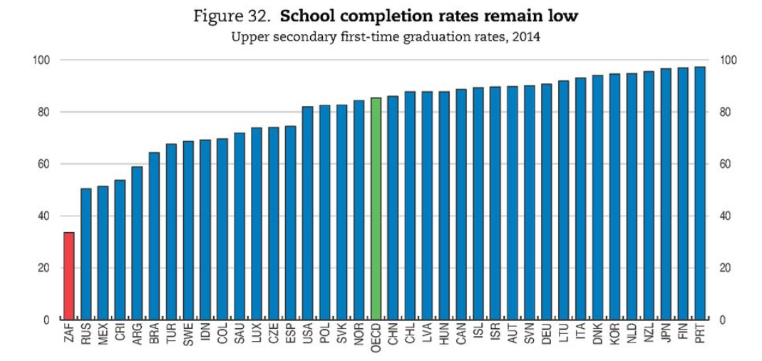 South Africa’s high level of unemployment is a major factor behind both poverty and inequality. Joblessness now stands at 27% compared to an already scandalous 24% in 2010. Stunningly, youth unemployment tops 50%. There are many reasons for such high levels of joblessness, but two will likely dominate pre-election policy debates, and I will deal with the role of wages later. However, there is broad consensus that the education system is failing. Indeed, the following Chart illustrates that RSA’s rate of school completion is the lowest in the OECD. Not only are students not graduating, but even those finishing do not have the skills currently sought: as revealed by a growing skills mismatch in the labour market.
