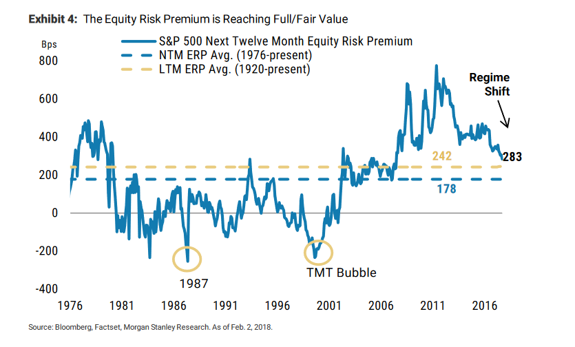 The following useful Chart from Morgan Stanley illustrates why markets now have reached this tipping point. At the stock market’s January peak, equities were trading at 18X 2018 projected earnings (in other words, the earnings yield was 5.5%). As US bond rose towards 3%, the equity risk premium shrank toward 250bp, bringing the premium roughly in line with its long-term average.