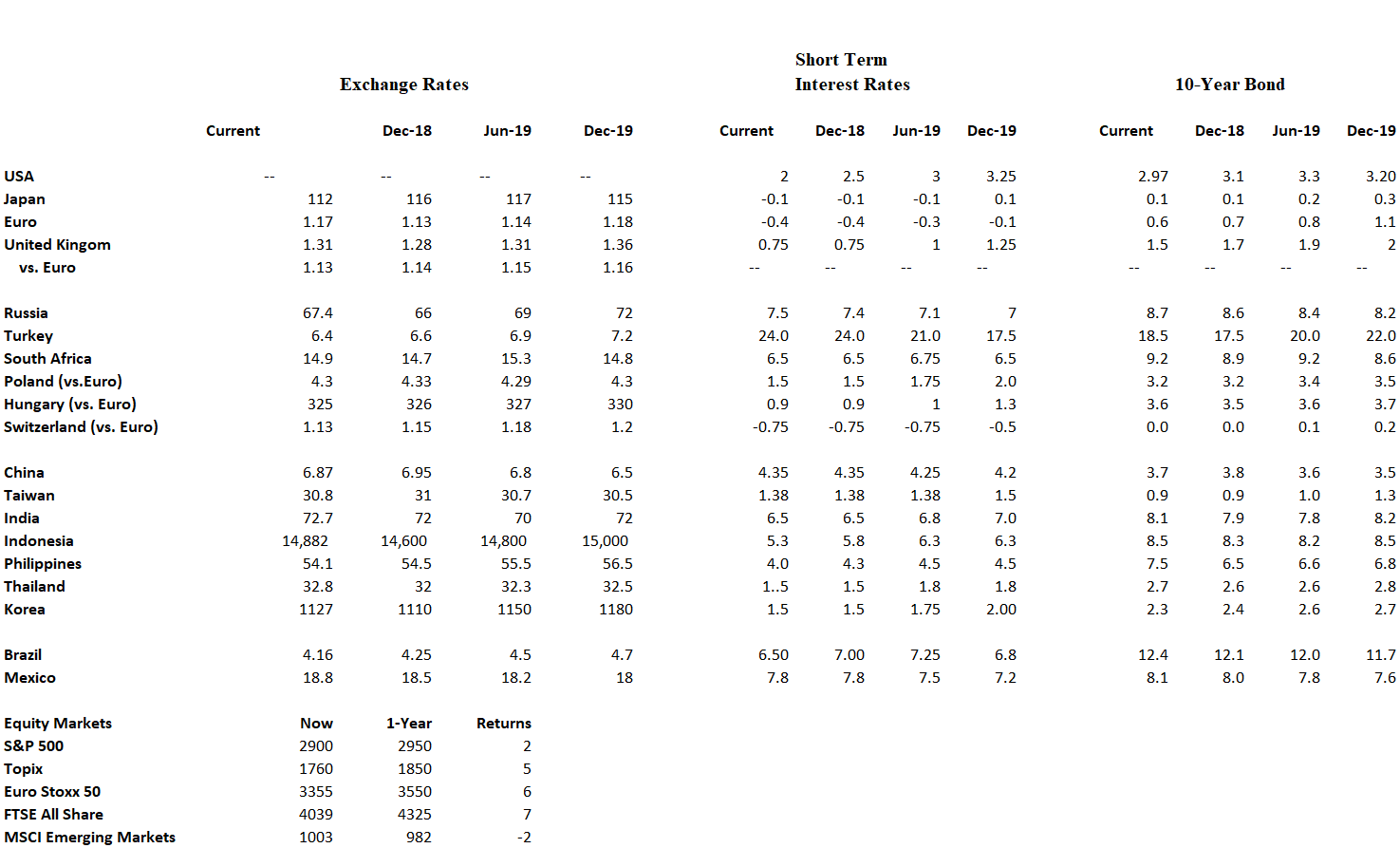 - Global equities will record another year of modest single-digit gains in 2019. I also expect the combination of escalating trade tensions, and signs of economic deceleration in both China and the USA will lead to a 10% slide in stock prices sometime during the next six months.