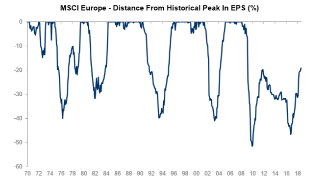 There are many reasons for Europe’s disappointing under-performance this year: weaker-than-expected growth, Italy’s budget and political worries, Brexit, vulnerability to a trade war, and the lack of progress on EU reform and securing the Euro’s future. Many of these issues will not be fully resolved in the near term, but there is a solid case for over-weighting European markets. First of all, Europe’s economy appears to be regaining momentum. And, European markets are considerably earlier in the earnings cycle compared to USA. The Chart below illustrates that EPS remains 20% below the peak of the previous cycles.
