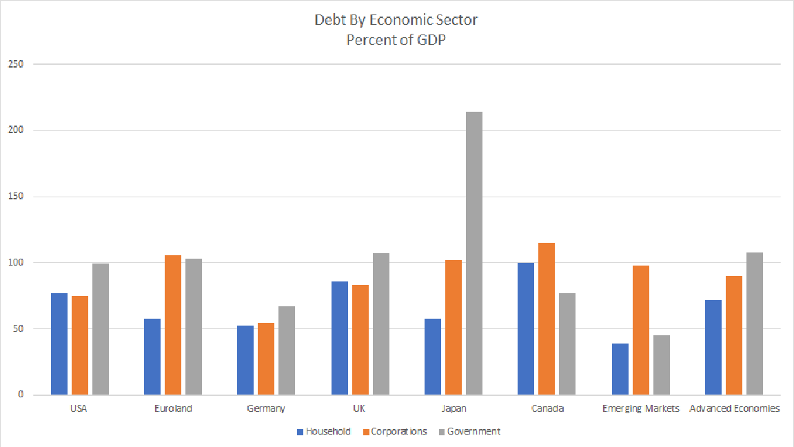 The Chart above illustrates the sharp increase in US debt: rising from 180% to 250% of GDP during the past two decades. The good news is that the ratio has stabilised in the past few years. And, as the following Chart shows, US debt remains slightly below other advanced economies (where the debt load totals 270% of GDP).